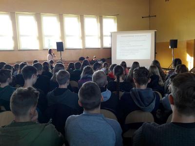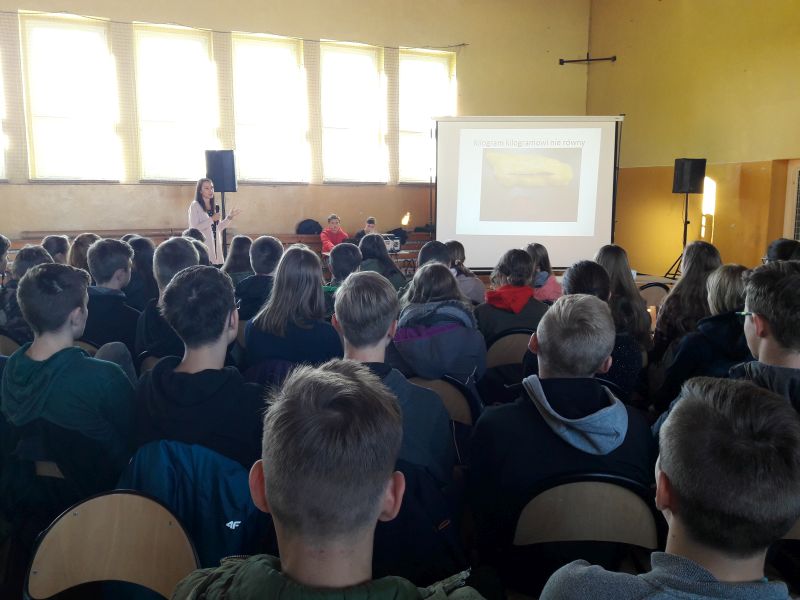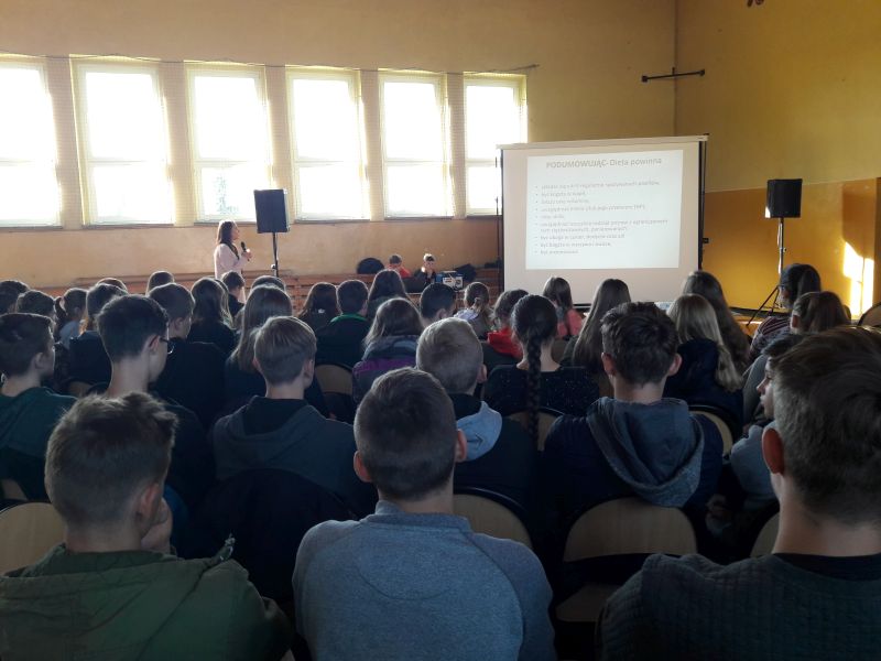 W dniu 26.09. uczniowie klas VII, VIII, oraz III a i b gimnazjum uczestniczyli w naszej szkole w spotkaniu z dietetykiem p. Joanną Wiśniewską dotyczące zdrowego sposobu odżywiania. Zajęcia pozwoliły uczniom w przystępny i atrakcyjny sposób poznać zasady prawidłowego żywienia. Pani dietetyk pokazała jak wybierać zdrowe produkty do codziennej diety oraz wskazała alternatywy dla niezdrowych i fast foodowych przekąsek i potraw. Uświadomiła również dzieciom jak niezdrowe jedzenie wpływa na nasze zdrowie. Omawiając piramidę zdrowego odżywiania zwróciła uwagę na to, co i w jakich proporcjach powinniśmy jeść, aby nasz organizm jak najdłużej pozostał w dobrej kondycji. Podczas spotkania został poruszony problem niezdrowego odchudzania oraz konsekwencji jakie temu mogą towarzyszyć. Spotkanie było bardzo udane bo i tematyka była bliska naszym uczniom.