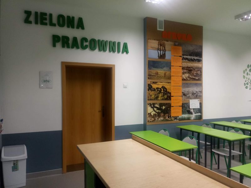 Od początku roku szkolnego 2018/2019 uczniowie naszej szkoły mogą uczyć się już w nowej pracowni przyrodniczej- „ZIELONEJ PRACOWNI”. W pracowni uczniowie zdobywają wiedzę z biologii, geografii, przyrody i fizyki. Dzięki funduszom pozyskanym z konkursu zorganizowanego przez Wojewódzki Fundusz Ochrony Środowiska i Gospodarki Wodnej w Katowicach, w którym panie nauczycielki Anna Kozielska i Maria Łapok wygrały 36000 zł, stworzono piękną i funkcjonalną pracownię przyrodniczą. W ramach otrzymanych środków pomalowano ściany, położono nową wykładzinę, zamontowano białe tablice, zakupiono nowe stoliki, krzesełka, szafy, rolety, stoły do demonstracji doświadczeń, fototapety i korek na ścianę. Resztę funduszów przeznaczono na zakup pomocy dydaktycznych do nauki przyrody, biologii, geografii i fizyki.