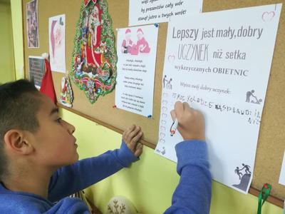W szkole w różnych miejscach zawieszone są kartki zachęcające do wpisania swojego dobrego uczynku "Lepszy jest mały drobny uczynek niż setka wykrzyczanych obietnic". Są jeszcze wolne miejsca - zapraszamy do uzupełniania wpisów.
