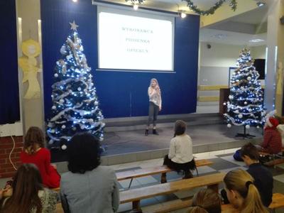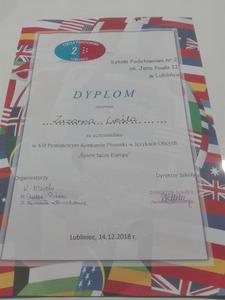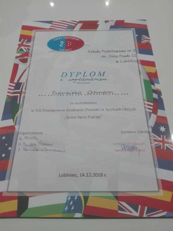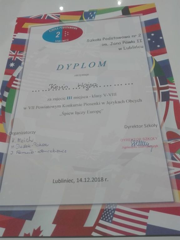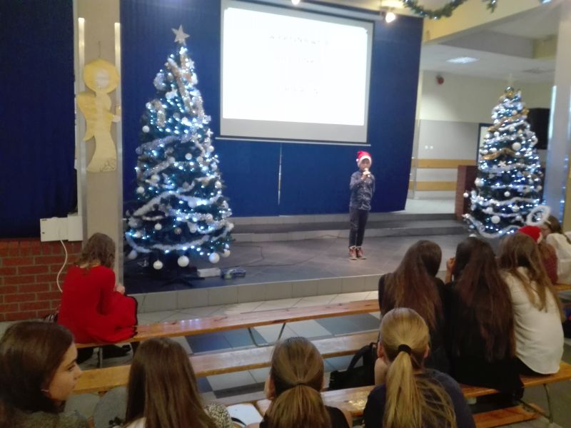 Dnia 14 grudnia 2018r. w Szkole Podstawowej nr 2 im. Jana Pawła II w Lublińcu odbył się VII Powiatowy Konkurs Piosenki w Językach Obcych "Śpiew łączy Europę”. W konkursie wzięło udział 43 uczestników z 11 różnych szkół podstawowych z powiatu. Konkurs składał się z jednego etapu, a trzyosobowe jury oceniało wykonawców. Uczestnicy zostali podzieleni na dwie kategorie wiekowe: klasy I-IV i V - VIII. W tym roku wszystkie konkursowe piosenki związane były z nadchodzącymi świętami Bożego Narodzenia. Trzech uczniów naszej szkoły również wzięło udział w tym konkursie. Kevin Wojsa z kl. 6 uplasował się na trzecim miejscu! Kevin wykonał piosenkę "All I want for Christmas is You". Na wyróżnienie zasłużyła Franziska Ochmann, która wykonała piosenkę " Wer am Weihnachten glaubt ". W konkursie wzięła udział też Zuzanna Cieśla, która zaśpiewała piosenkę „ It’s beginning to look a lot like Christmas”. Zwycięzcy otrzymali atrakcyjne nagrody w postaci bonów upominkowych i licznych gadżetów. Serdecznie gratulujemy !
