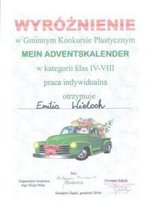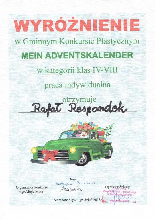 Dnia 6 grudnia 2018r. w Zespole Szkolno - Przedszkolnym w Sierakowie Śląskim odbyło się uroczyste wręczenie nagród dla zwycięzców w gminnym konkursie na kalendarz adwentowy. Uczniowie naszej szkoły oraz ich rodzice bardzo chętnie wzięli w nim udział i wykonali wspaniałe prace! Wyróżnienie w kategorii klas IV-VIII zdobyli: Rafał Respondek z klasy Va, Emilia Wieloch z klasy IVb oraz Martyna Świtała z klasy VII. W kategorii - praca rodzinna – wyróżniona została rodzina Kozuch. Wszystkim uczestnikom konkursu składamy serdeczne podziękowania za udział i ogromny wysiłek włożony w wykonanie przepięknych kalendarzy adwentowych. Zwycięzcom GRATULUJEMY!!!