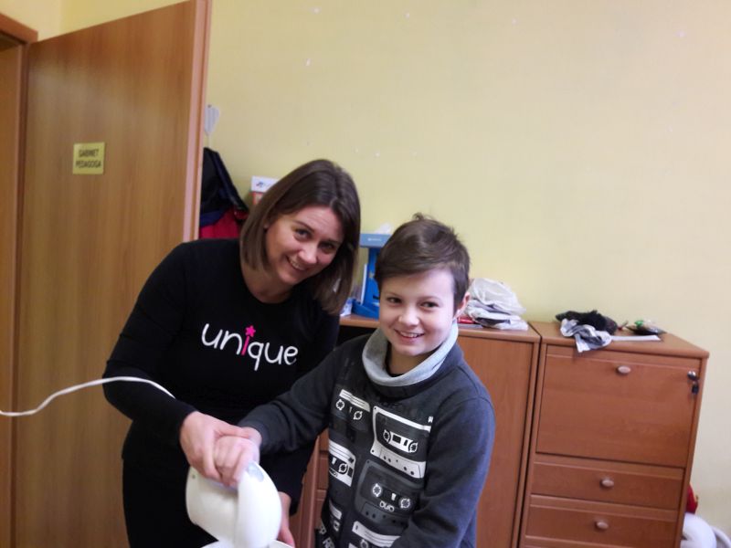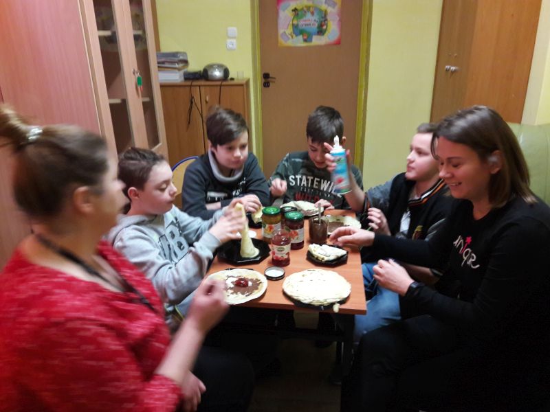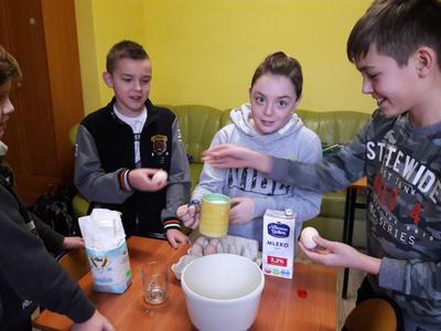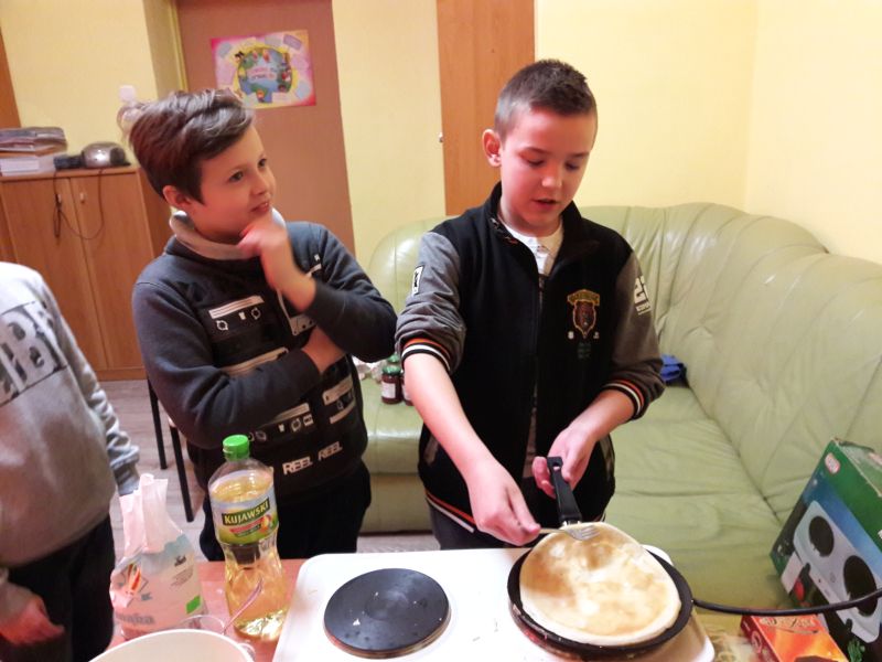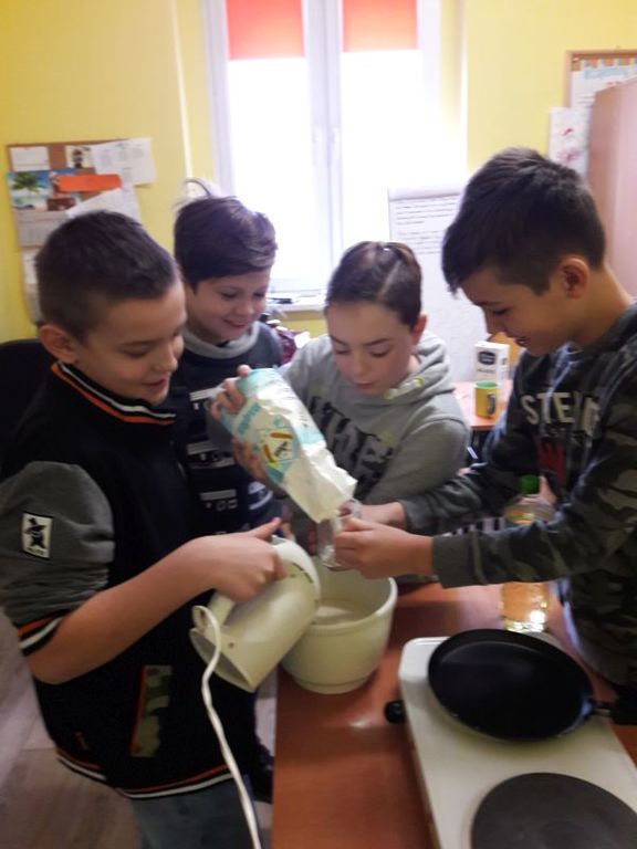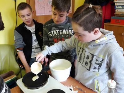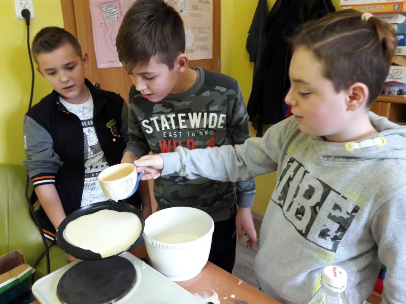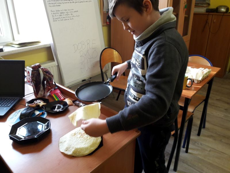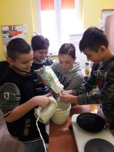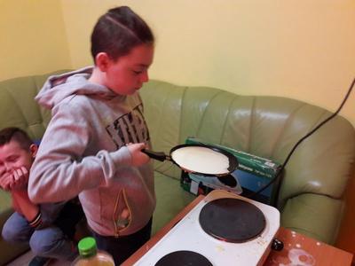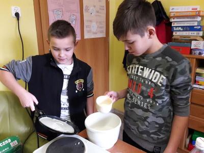 Namówiliśmy naszą panią pedagog na robienie naleśników na zajęciach korekcyjno-kompensacyjnych i w dniu 04.01.2019r. zrealizowaliśmy nasz pomysł i przez 2 godziny przygotowaliśmy naleśniki. Najpierw zrobiliśmy ciasto naleśnikowe, a potem piekliśmy naleśniki na patelni. Każdy wylewał ciasto i je smażył. Okazało się, że jesteśmy mistrzami w przewracaniu naleśników w powietrzu, podrzucaliśmy je do góry i żaden nie spadł na podłogę. Piękny zapach smażonych naleśników rozszedł się po całej szkole, przyciągnął nawet dyrekcję szkoły. Po upieczeniu naleśników zrobiliśmy naleśnikową ucztę i zjedliśmy je z nutellą, śmietaną i dżemem. Taki mix był idealny. Zaprosiliśmy nawet na naszą biesiadę naszą panią wychowawczynię p. Łapok, a pani pedagog była z naszej pracy zespołowej bardzo zadowolona.