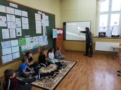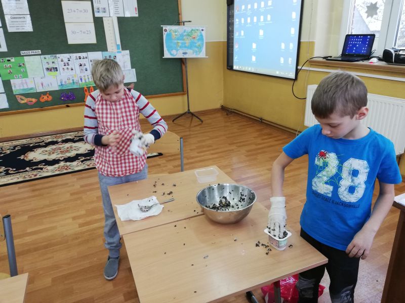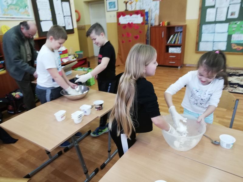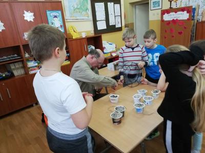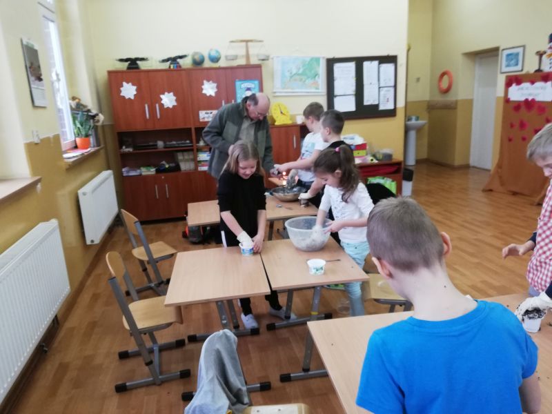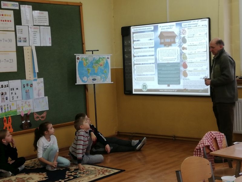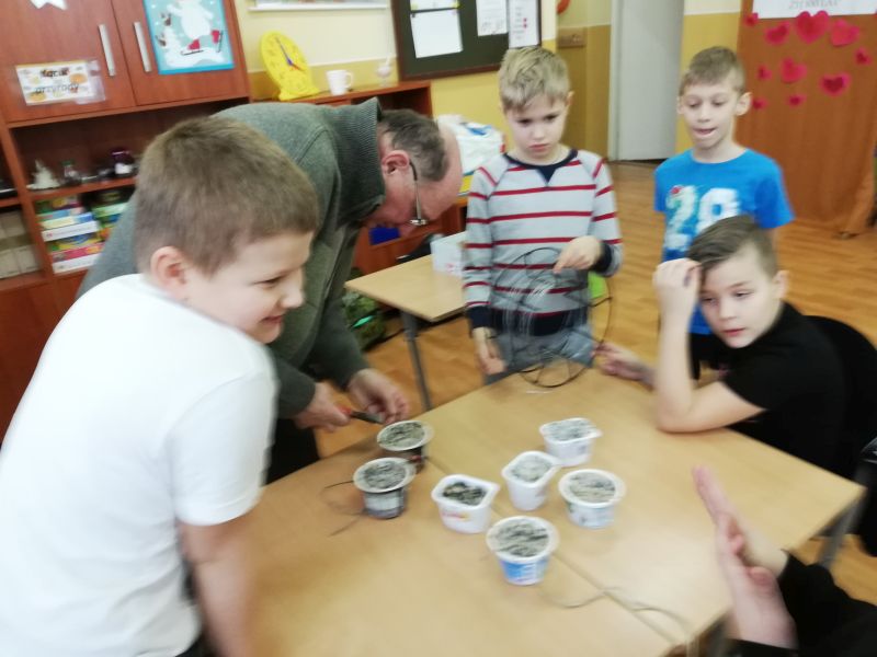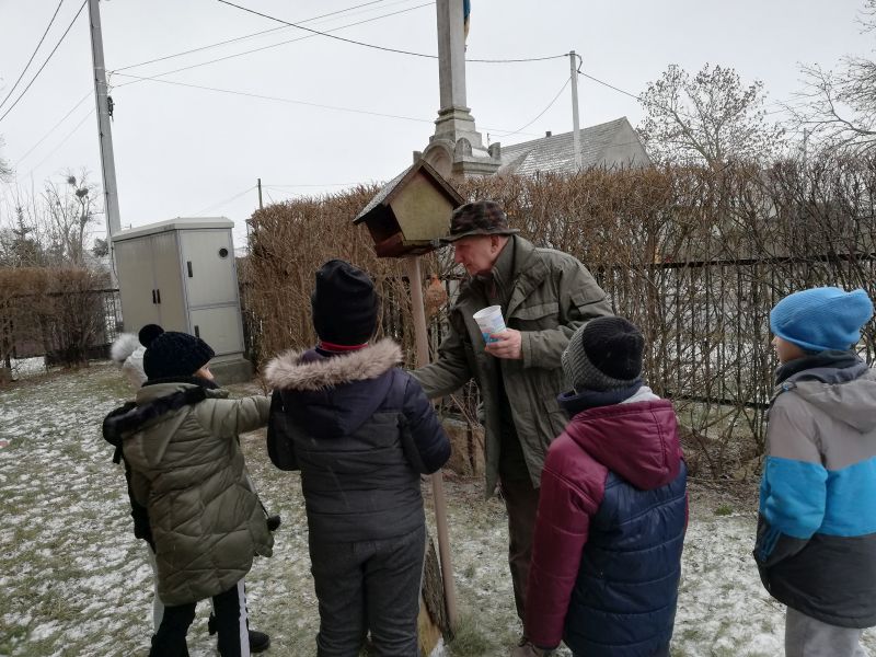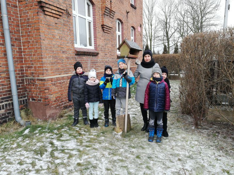 Zima to pora roku w czasie, której zwierzęta leśne oraz ptaki potrzebują szczególnej pomocy ze strony człowieka. W tym okresie gruba warstwa zmrożonego śniegu uniemożliwia zdobycie pokarmu. Widząc ten problem klasa druga Szkoły Filialnej w Glinicy postanowiła pomóc ptakom i systematycznie je dokarmiać. W dniu 24.01.2019 r. podczas zajęć pan myśliwy Mieczysław Kozina zapoznał dzieci z gatunkami ptaków, które pozostają na zimę w Polsce. Opowiedział, czym można karmić ptaki, co jest dla nich najbardziej wartościowe oraz jakich pokarmów nie wolno wsypywać do karmnika. Uczniowie na zajęciach dla małych skrzydlatych przyjaciół wykonali przysmaki łącząc tłuszcz z ziarnami. Przygotowane kubeczki z jedzeniem dzieci wspólnie z panem myśliwym i nauczycielem zaniosły do karmnika.