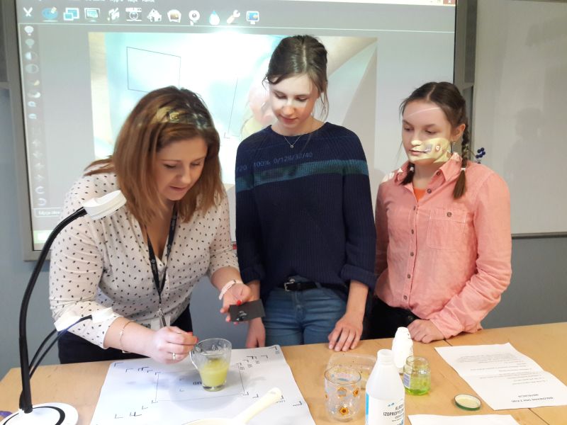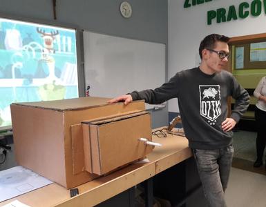 Konkurs uświetnili uczniowie klasy III a gimnazjum, którzy przedstawili działający sejf wykonany z tektury, dźwig hydrauliczny oraz doświadczenie biologiczne - izolowanie DNA z owoców kiwi.