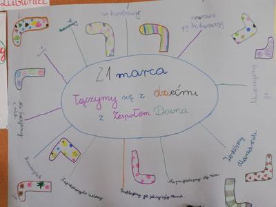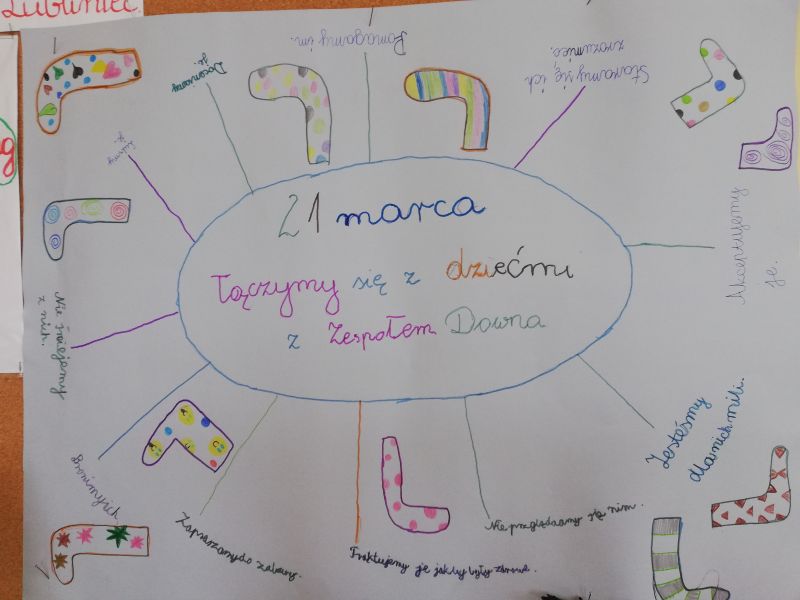W tym dniu uczniowie łączyli się także z dziećmi z Zespołem Downa, poprzez ubranie dwóch różnych skarpetek. Na zajęciach dzieci wykonały plakat, na którym przedstawiły mapę myśli. Wypisały hasła, w których wyraziły swoją akceptację i zrozumienie dla dzieci niepełnosprawnych.