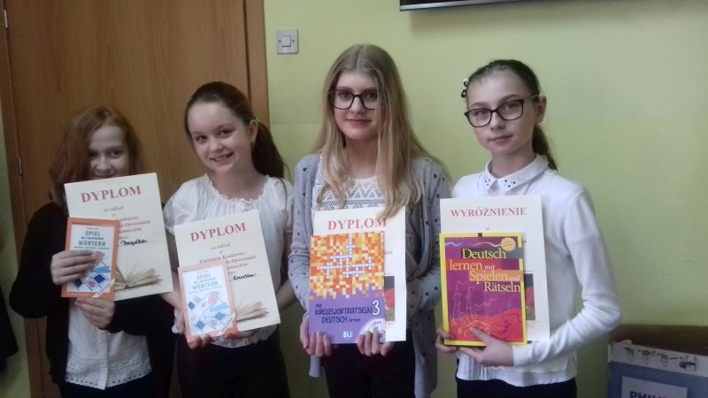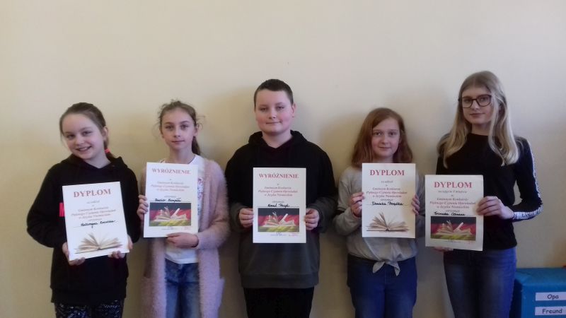28 marca 2019 r. pięcioro uczniów naszej szkoły wzięło udział w Gminnym Konkursie Pięknego Czytania Opowiadań w Języku Niemieckim, zorganizowanym przez nauczycieli języka niemieckiego z Zespołu Szkolno-Przedszkolnego w Sierakowie Śląskim. Uczestnikami konkursu byli uczniowie klas V-VII. Najlepiej swoje umiejętności językowe zaprezentowała uczennica naszej szkoły – Franziska Ochmann z klasy VII, która zajęła I miejsce. Wyróżnienia w konkursie również przypadły uczniom naszej szkoły. Zdobyli je: uczennica Amelia Kompała z klasy V b oraz Kamil Piecyk - uczeń klasy V a. Bardzo cieszymy się ze zwycięstwaJ Wszystkim uczestnikom serdecznie GRATULUJEMY !!!