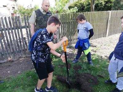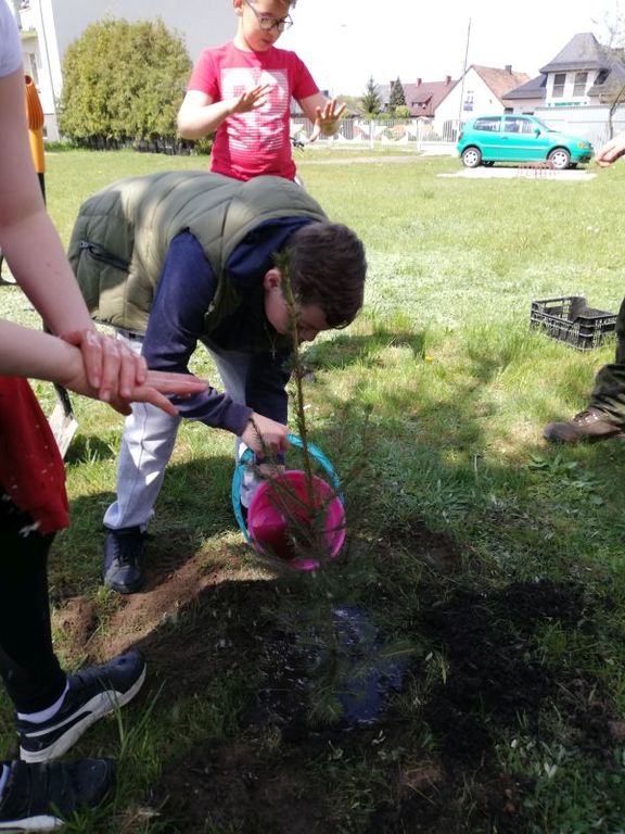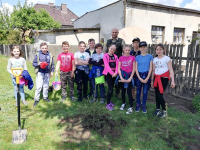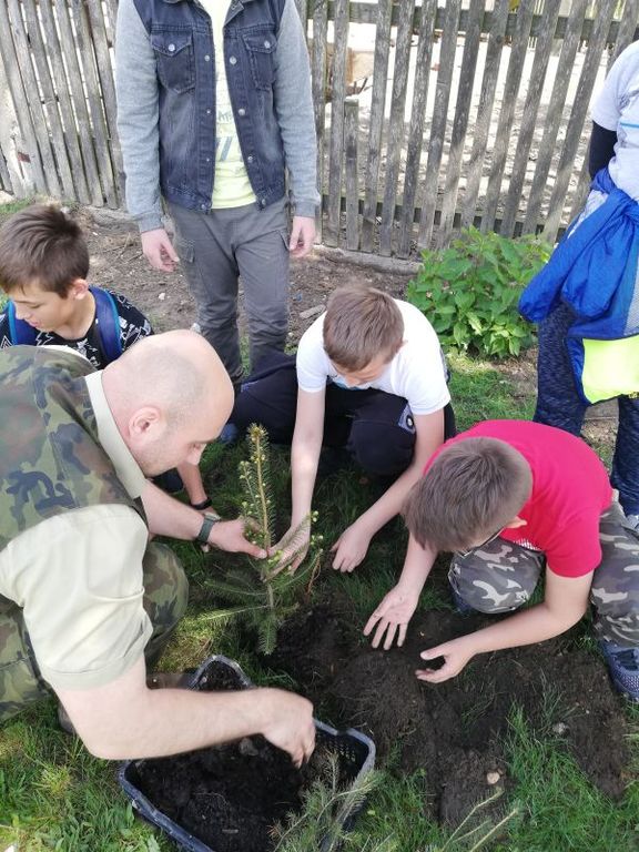 Ostatnim i głównym punktem spotkania było przejście na teren przedszkola i posadzenie sadzonek świerka pospolitego (Picea abies L.). Uczniowie pod nadzorem i z pomocą pana leśnika wykopali dołki, posadzili drzewka i podlali je. Po posadzeniu drzewek, cała grupa zrobiła sobie pamiątkowe zdjęcie z panem leśnikiem.