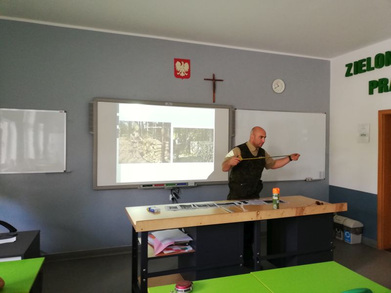 Wszyscy z zainteresowaniem słuchali, byli bardzo aktywni, zadawali pytania i udzielali wyczerpujących odpowiedzi. Uczniowie dowiedzieli się m.in., że do zadań pana leśnika należy dbanie o lasy (edukacja ludzi, czynne działania w postaci sadzeń drzew, pielęgnowanie drzew - wyznaczanie trzebieży, przeprowadzanie czyszczeń oraz ochrona drzewostanu przed szkodnikami) Pan leśnik zajmuje się również produkcją drewna do różnych celów (pozyskiwanie, odbiórka i sprzedaż drewna). Uczniowie wykazali się ogromną wiedzą na temat gatunków roślin i zwierząt występujących w polskich lasach, a także sposobami ochrony lasów. Pod koniec spotkania każdy z uczniów mógł obejrzeć narzędzia, którymi na co dzień posługuje się pan leśnik tj. średnicomierz (klupa), specjalna taśma miernicza, biodegradowalna kreda i spray do oznaczania drewna, ryszpak, ośnik, numerator oraz rejestrator. Po aktywnych zajęciach uczniowie posilili się słodkim poczęstunkiem i ciepłą herbatą oraz otrzymali gadżety z Nadleśnictwa Lubliniec.
