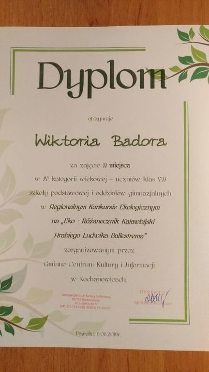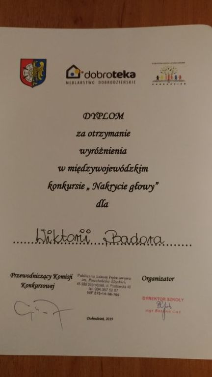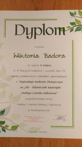 Uczennica klasy IIIa gimnazjum, Wiktoria Badora, odniosła sukces w trzech konkursach o tematyce plastyczno – technicznej. Zajęła ona III miejsce w Wojewódzkim Konkursie Hafciarskim „Świat Malowany Nitką”. Przedmiotem konkursu było wykonanie pracy techniką haftu matematycznego, a tematem przewodnim pracy „Żółwie w różnych odsłonach”. Następnym konkursem był Międzywojewódzki Konkurs „Nakrycie Głowy” organizowany przez Publiczną Szkołę Podstawową w Dobrodzieniu przy współpracy z Dobroteką. Celem głównym konkursu było wykonanie i prezentacja nakrycia głowy, propagowanie tradycji rzemiosła artystycznego wśród młodzieży, rozwijanie i doskonalenie kreatywności młodych ludzi. W tym konkursie Wiktoria otrzymała wyróżnienie. II miejsce uczennica zdobyła w Regionalnym Konkursie na Eko – Różanecznik. Zadaniem konkursu było wykonanie „Eko – Różanecznika Katawbijskiego” z materiałów ekologicznych lub poddawanych recyklingowi w dowolnej formie (płaska lub przestrzenna). Dopuszczone materiały obejmowały m.in.: drewno, szyszki, zboża, kasztany, gałązki, makaron, liście, suszone owoce, tektura, butelki PET, sznurki, korki itp. Prace Wiktorii były bardzo pracochłonne, pomysłowe i starannie wykonane.