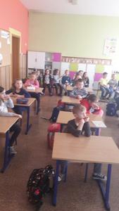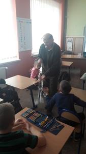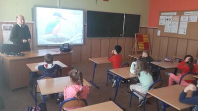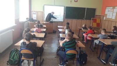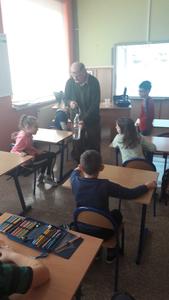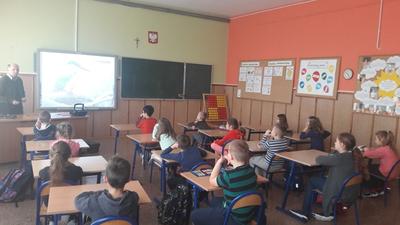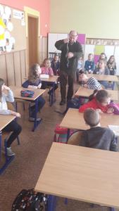 Dnia 9 grudnia 2019r. naszą szkołę odwiedził Pan Mieczysław Kozina - myśliwy z Koła Łowieckiego Hubertus. Na spotkanie zaproszono uczniów klasy IIa i IIb. Tematem zajęć było przygotowanie zwierząt leśnych do zimy. Podczas zajęć dzieci dowiedziały się w jaki sposób pomóc zwierzętom i ptakom przetrwać zimę i dlatego niektóre zwierzęta gromadzą zapasy, a inne zapadają w sen zimowy. Pan myśliwy zadawał uczniom wiele pytań, z którymi dzieci bardzo dobrze sobie radziły. Wykazały się dużą wiedzą na temat gatunków ptaków, zarówno tych, które odlatują, jak i tych, które pozostają w Polsce na zimę. Na koniec spotkania uczniowie otrzymali pamiątkowe kolorowanki.
