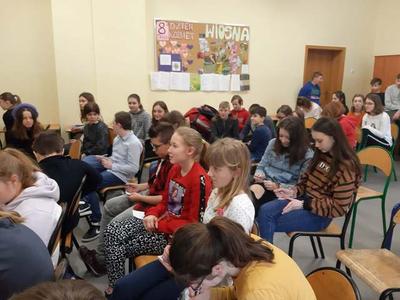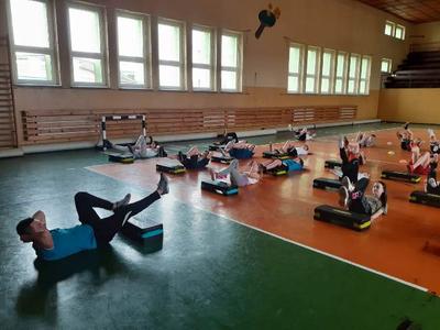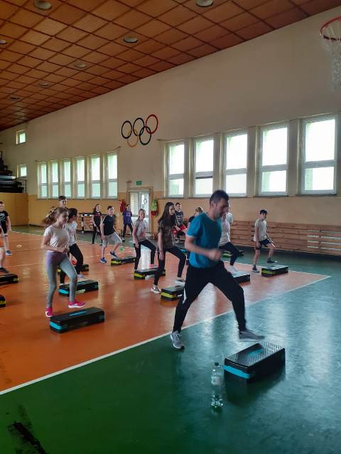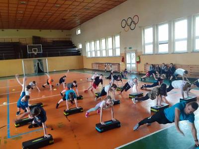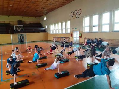 Uczniowie uczestniczyli również w zajęciach praktycznych. Ich celem było propagowanie nowoczesnych form ruchu, a w tym przypadku ćwiczeń na stepach. Na hali sportowej dwie klasy wykonały układ ćwiczeń do muzyki, wzmacniający wszystkie partie mięśniowe. Uczniowie bardzo zaangażowali się w zajęcia, bo step wymaga ogromnej energii przy wykonywaniu ćwiczeń w intensywnym tempie. I bardzo im się taka forma ruchu podobała.