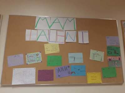 Uczniowie przygotowali ciekawe wizytówki obrazujące ich talenty, które uświetniają klasową gazetkę ścienną pt. „Mam talent”.