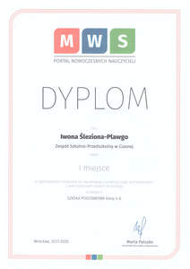Z przyjemnością informujemy, że nauczycielka naszej szkoły, pani Iwona Śleziona-Plawgo, otrzymała I miejsce w „Ogólnopolskim konkursie na najciekawszy scenariusz zajęć wychowawczych z wykorzystaniem nowych technologii”. Jest to tym bardziej ważne, że pani Iwona od dawna podejmuje rozmaite, dodatkowe działania na rzecz rozwoju uczniów i szkoły. Zdobywa granty Centrum Mistrzostwa Informatycznego, jest autorką innowacji, realizatorką ciekawych projektów i programów, prowadzi pozalekcyjne zajęcia artystyczne i informatyczne. Jej zasługą jest to, że w naszej szkole uczniowie mogą rozwijać umiejętności kodowania i programowaniaoraz brać udział w wielu kreatywnych i twórczych działaniach w dziedzinie nowoczesnych technologii. Gratulujemy wyróżnienia!