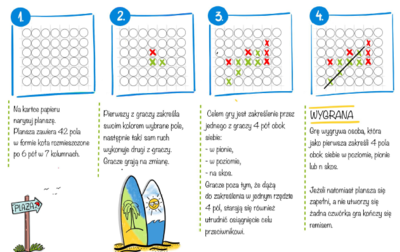 Pewnie każdy z Was doskonale zna grę, która nazywa się „Kółko – Krzyżyk”. Przedstawię Wam kolejny „rodzinny czasoumilacz”, w którym także będziemy zaznaczać krzyżyki. Gra nazywa się: „połącz 4”. Jak zwykle potrzebujemy tylko kartki w kratkę oraz dwa długopisy w różnych kolorach.