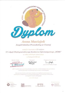 Z przyjemnością informujemy, że uczennica klasy IIIb Anna Maciejok zajęła III miejsce w XV edycji Konkursu Informatycznego „Bóbr” 2020.