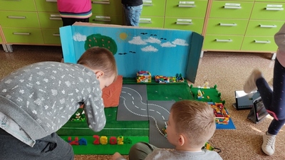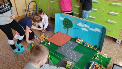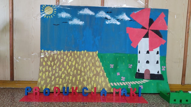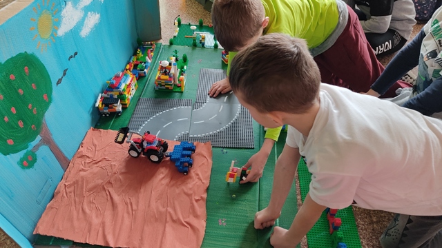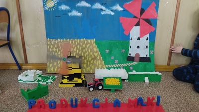 Gdy już nasze maszyny były gotowe do pracy uczniowie wspólnie wykonali makietę wsi oraz pól uprawnych (wszystko przy użyciu klocków). Następnie w trakcie swobodnej pogadanki utrwaliliśmy sobie uzyskane wcześniej wiadomości na temat pracy rolnika podczas uprawy zboża.