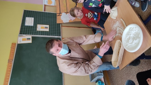 Udało się! J Na to spotkanie przybył piekarz. Opowiedział nam o swojej pracy, rodzajach pieczywa oraz zaprezentował jak przygotowuje się ciasto na chleb. Dzieci z uwagą wysłuchały naszego gościa, a następnie zadały szereg pytań dotyczących powstawania chleba.