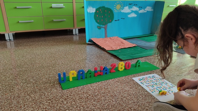 Po wprowadzeniu uczniowie ułożyli z klocków konstrukcyjnych napis obrazujący temat pierwszego etapu: „Uprawa zboża”.