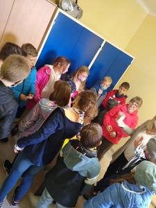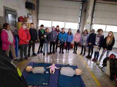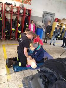 - Ochotnicza Straż Pożarna- strażacy Wojtek Jaworek i Mateusz Hernik oraz Armin Picz przedstawili uczniom podstawowy sprzęt strażacki i ratowniczy, pokazali jak wygląda samochód strażacki, wykonali pokaz pomocy ratowniczej - zadaniem uczniów było prawidłowe wykonanie masażu serca na fantomach.