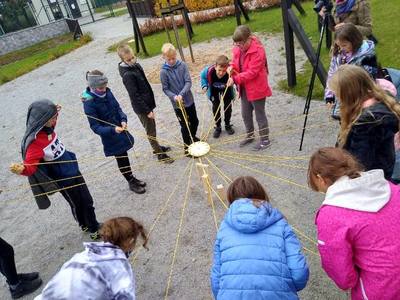 - Klocki – baza współpracy, uczniowie musieli ułożyć wieżę z klocków, przy użyciu tylko sznurków. Zadanie wymagało od uczestników współpracy, wzajemnego słuchania się i wydawania jasnych komunikatów.