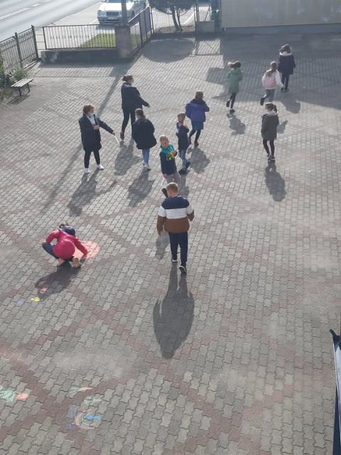 - Odpoczynek – baza, gdzie uczniowie mogli złapać oddech zrelaksować się. Na placu szkolnym malowali kredą.