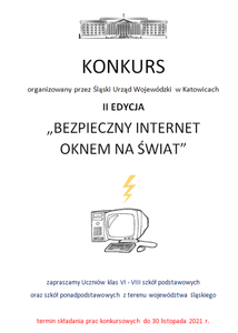 Konkurs „Bezpieczny Internet oknem na świat” organizowany przez Śląski Urząd Wojewódzki w Katowicach. Zapraszamy uczniów klas VI - VIII szkół podstawowych z terenu województwa śląskiego termin składania prac konkursowych do 30 listopada 2021 r.