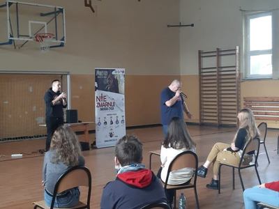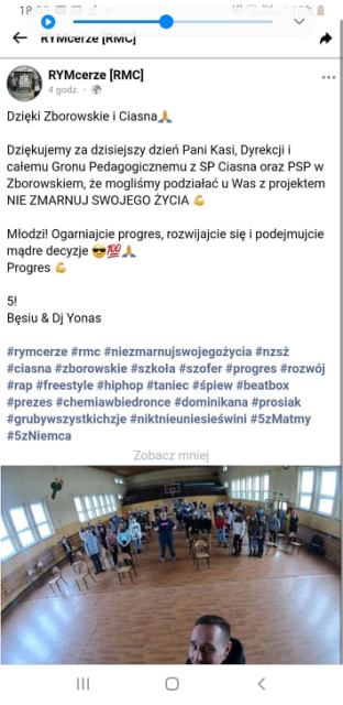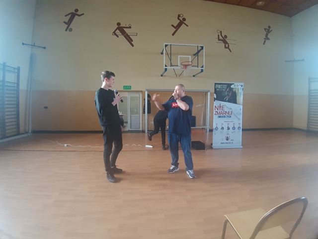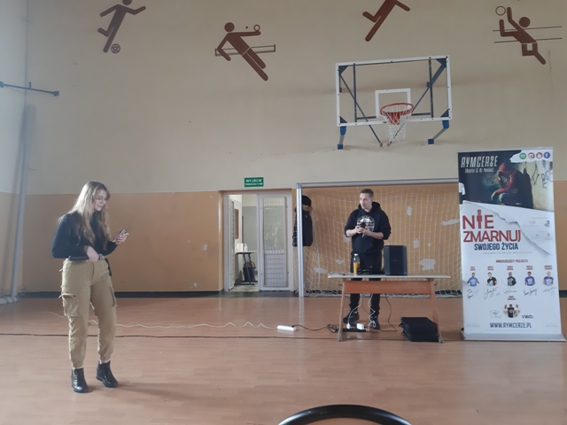 Bęsiu opowiadał o swoich trudnych doświadczeniach i jednocześnie nawiązał świetną relację z młodzieżą: „ogarnij progres”, „idź do przodu” – to hasła przewodnie spotkania. RYMcerze dali również popis raperski, a także zaprosili do rapowania naszych uczniów. Ideą przewodnią w tekstach ich utworów jest myśl: „Wszystko zależy od Ciebie- jesteś panem swojego losu”.