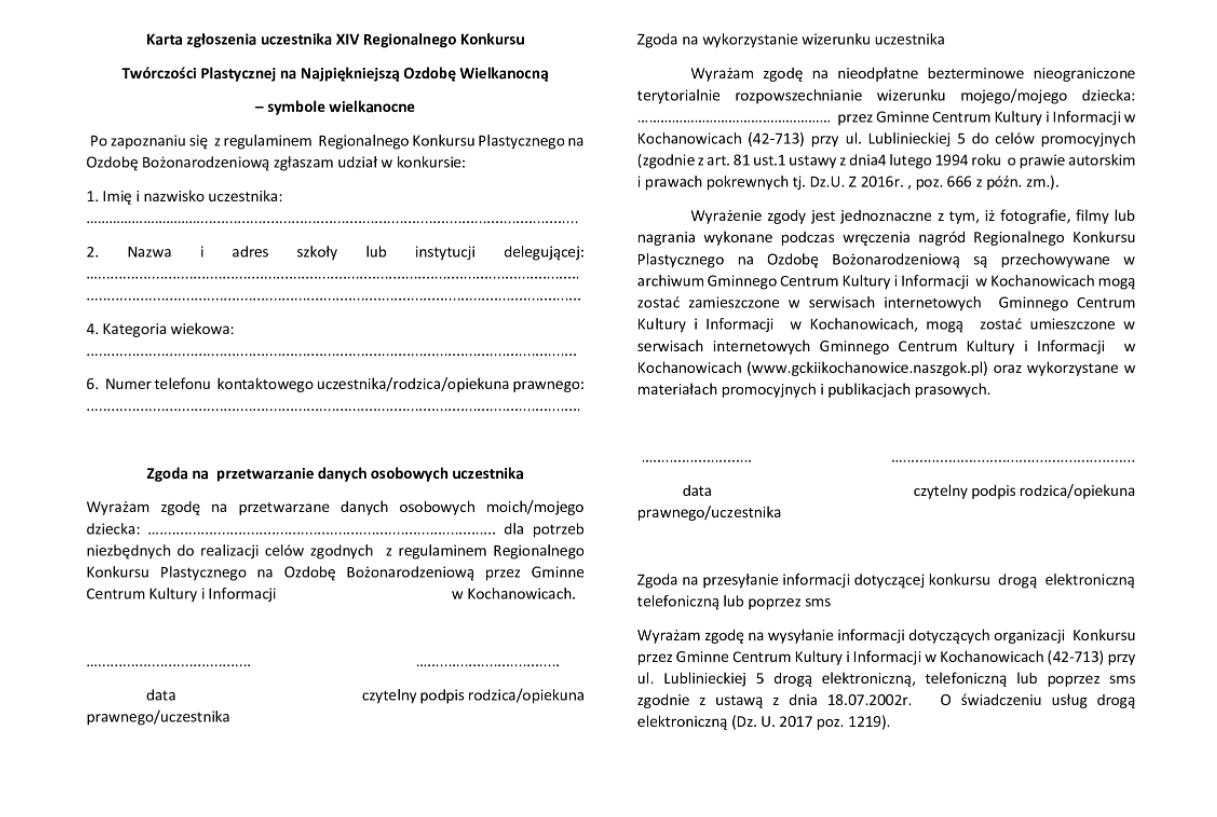 Konkursy wielkanocne – post zbiorczy Konkursy wielkanocne 2022r. Zdjęcia Załączniki FORMULARZ ZGŁOSZENIOWY Lubliniec MDK [19.69 kB] ZGODA RODZICÓW Wola Zagłobieńska [11.08 kB] GCKII Kochanowice [287.37 kB] Konkursy wielkanocne [308.28 kB] Zobacz również Sukcesy uczniów klasy I w ogólnopolskich konkursach... Powitanie Wiosny w Molnej Dzień wiosny! Konkursy wielkanocne – post zbiorczy Wyniki gminnego konkursu przyrodniczo- plastycznego... Konkurs NBP „Zanim wydam… O finansach w przedszkolach... 26 marca 2022 Aktualności Wydrukuj Udostępnij Wyświetlono: 649