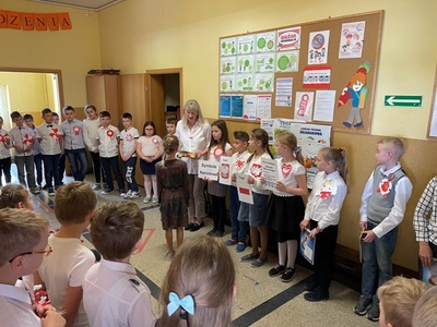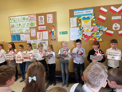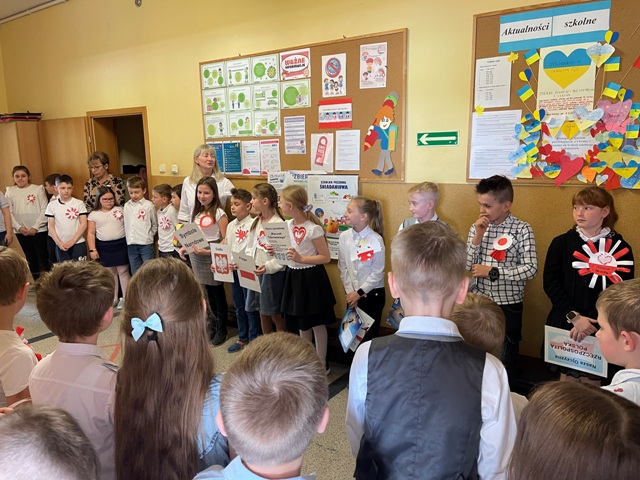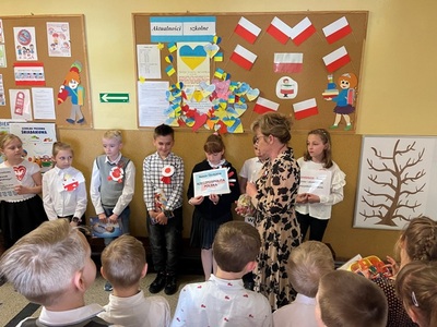 W piątek 29 kwietnia 2022 r. uczniowie klas I – III uczcili nadchodzące święta 1, 2 i 3 maja uroczystym apelem. W tym dniu wszystkie dzieci przyszły do szkoły odświętnie ubrane. Bardzo pięknie wyglądały przypięte na ich białych bluzkach i koszulach własnoręcznie wykonane kotyliony w barwach narodowych. Dzieci z trzeciej klasy przeczytały informacje na temat Święta Pracy, Flagi i Uchwalenia Konstytucji 3 Maja, a także omówiły symbole narodowe. W czasie ich prezentacji uczniowie w pozycji „na baczność” odśpiewali hymn narodowy „Mazurek Dąbrowskiego”. Następnie pierwszoklasiści wyrecytowali wiersz Władysława Bełzy „Katechizm małego Polaka” rozpoczynający się od słów „Kto ty jesteś? - Polak mały”. Miłym zakończeniem apelu było wspólne zaśpiewanie refrenu piosenki o Polsce: