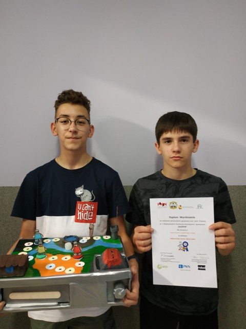 W kategorii klas VII-VIII wyróżnienie za najlepsze opracowanie językowe oraz tytuł finalisty zdobyła drużyna z klasy VIII b w składzie: Maksymilian Kurek, Jakub Lubos. Uczniowie przygotowali pracę pt. ,,Ritter Rennen.’’