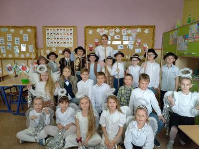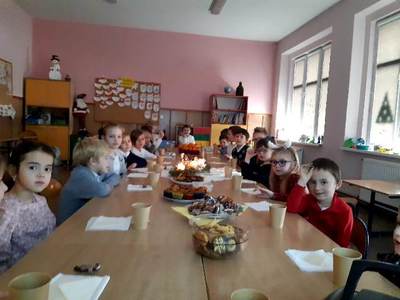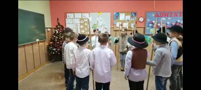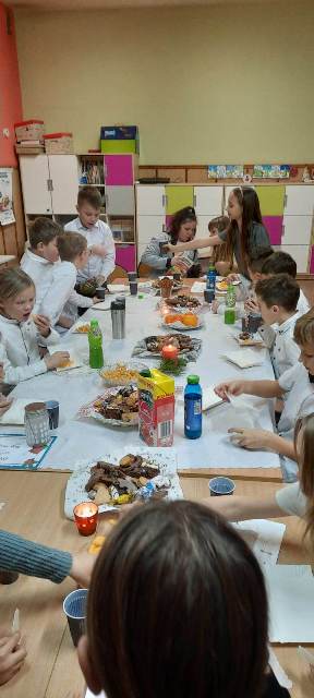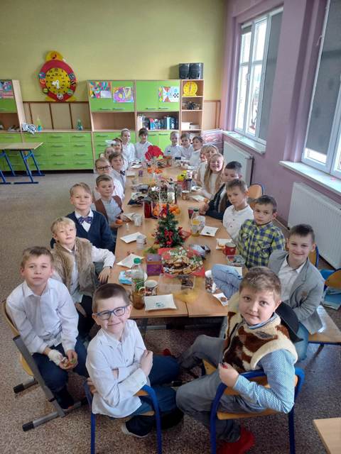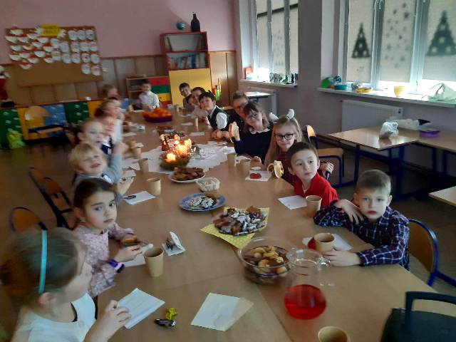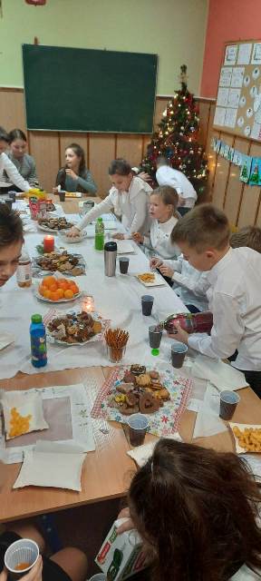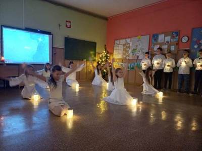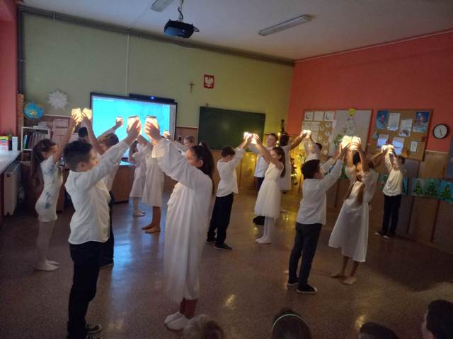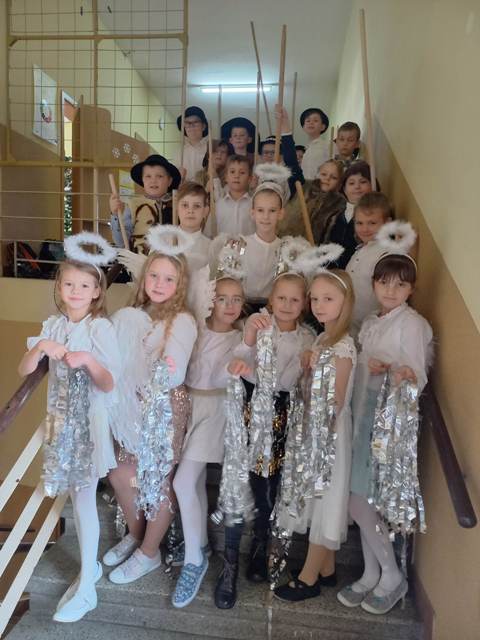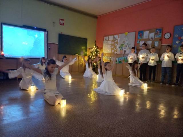 Ostatni przedświąteczny dzień w szkole upłynął naszym uczniom w wyjątkowej i świątecznej atmosferze. Na korytarzu można było spotkać grupę pasterzy w kapeluszach, lub minąć aniołka w śnieżnobiałej szacie. Korzystając z ostatnich wspólnych chwil przed Świętami Bożego Narodzenia, delektowaliśmy się radosną i magiczna atmosferą, którą budowały piękne tańce uczniów, wyśpiewane kolędy i pastorałki, stroje i dekoracje, oraz zapach pierników i mandarynek unoszących się w powietrzu. Po uczcie dla zmysłów w postaci występów, przyszedł czas na ucztę dla podniebienia. Uczniowie udali się do swoich klas, gdzie łamali się opłatkiem, składając sobie życzenia bożonarodzeniowe oraz degustowali przyniesione z domów wigilijne smakołyki. Wigilie klasowe zakończyło wesołe kolędowanie. Dzieci pięknie wprowadzone w świąteczny nastrój wróciły do domu nucąc cichutko najpiękniejsze kolędy...