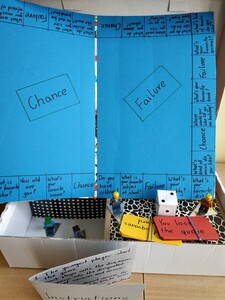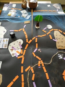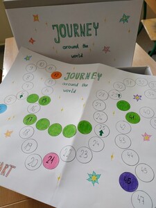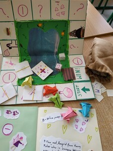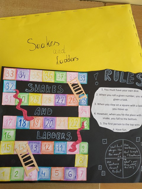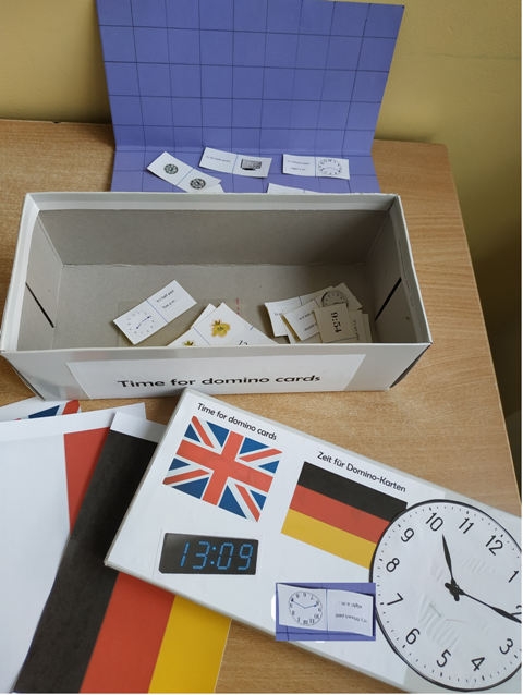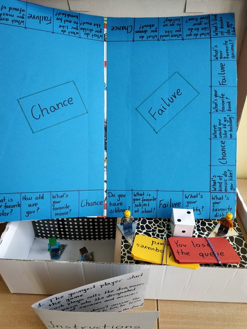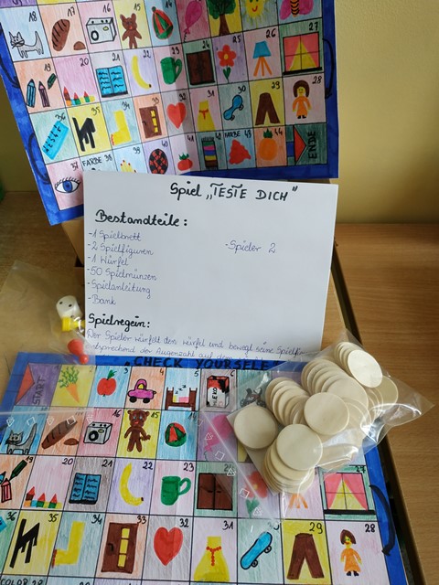 Uczniowie wykonali samodzielnie plansze, pionki i inne elementy gier oraz zastosowali języki obce, pisząc regulaminy gier.