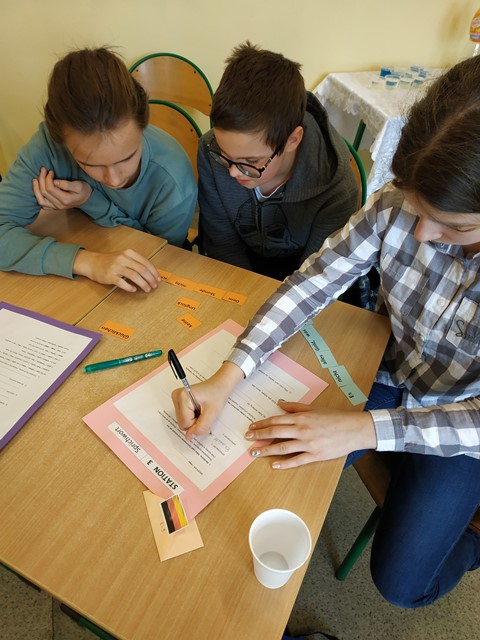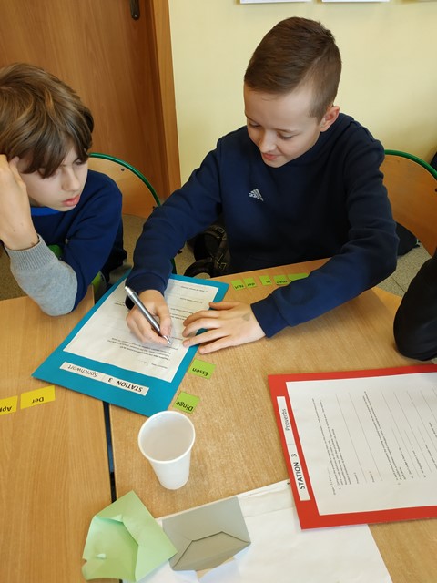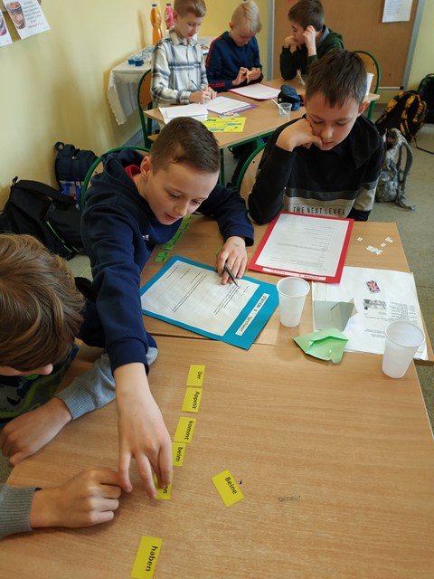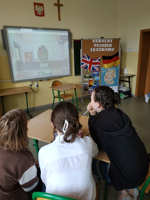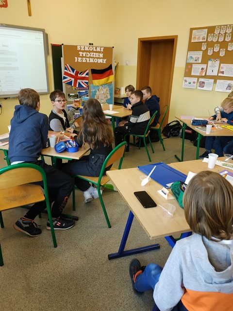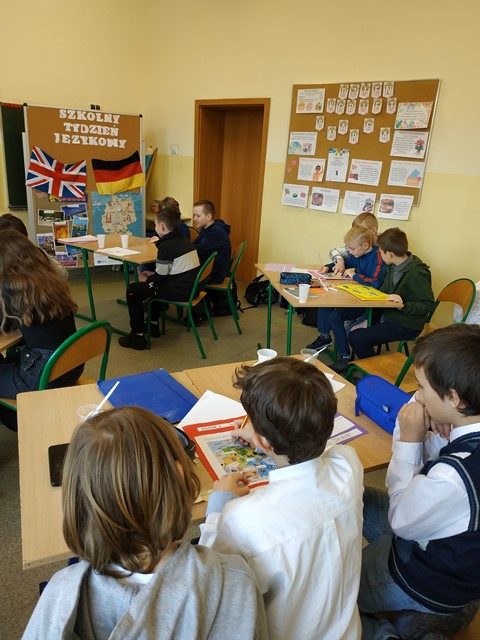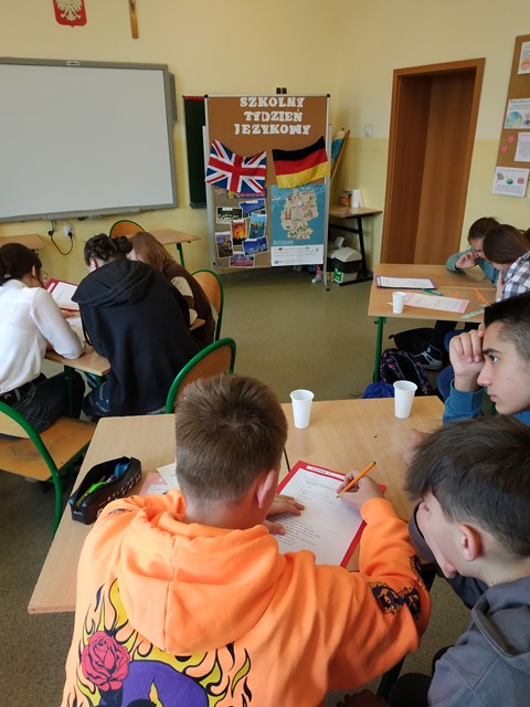 Nasz Szkolny Tydzień Językowy zakończyliśmy wielką rywalizacją drużyn klasowych. Bój językowy toczył się w dwóch grupach wiekowych: klasy IV-V oraz klasy VI-VIII. Trzyosobowe drużyny wytypowane z każdej klasy zmierzyły się z różnorodnymi zadaniami w języku niemieckim i angielskim. Uczniowie musieli wykazać sie wiedzą na temat geografii i kultury Niemiec oraz Anglii. Rozwiązywali zadania quizowe dotyczące zwyczajów wielkanocnych w krajach angielsko- i niemieckojęzycznych. W tym roku wykorzystaliśmy aplikację Kahoot do zabawy ze słownictwem, Nasi uczniowie wykazali się również znajomością angielskich i niemieckich przysłów. Najtrudniejszym zadaniem było przygotowanie przez uczniów scenek w językach obcych na zadany temat, należało przygotować również rekwizyty. Drużyny były oceniane pod względem swobody prowadzenia rozmowy w języku obcym, płynności i poprawności językowej.
