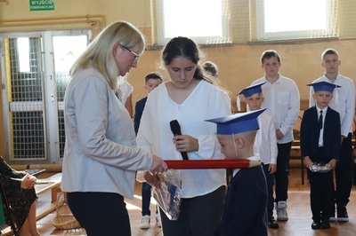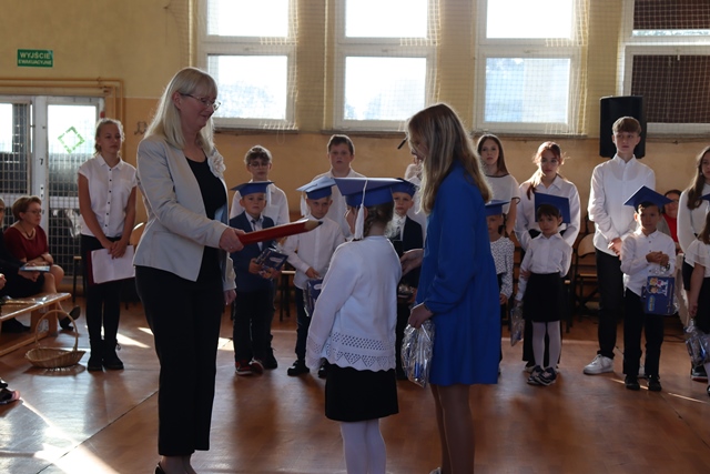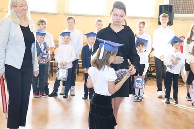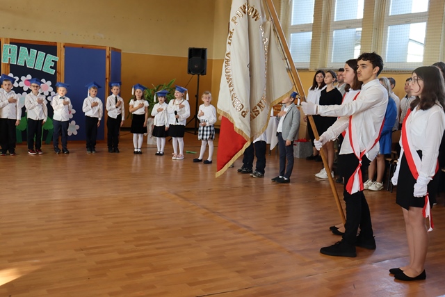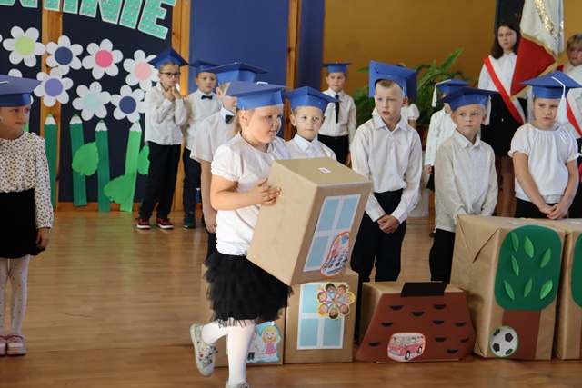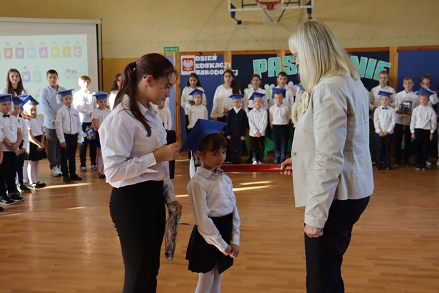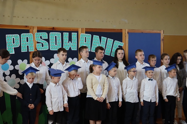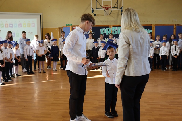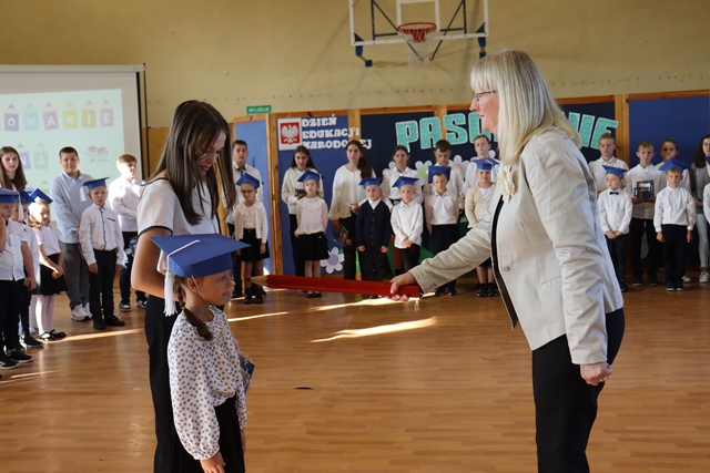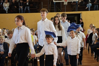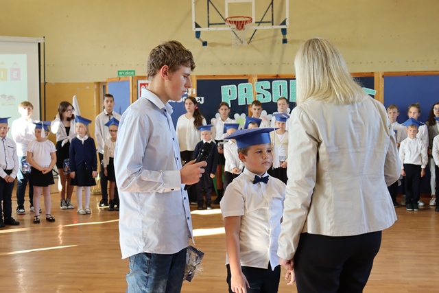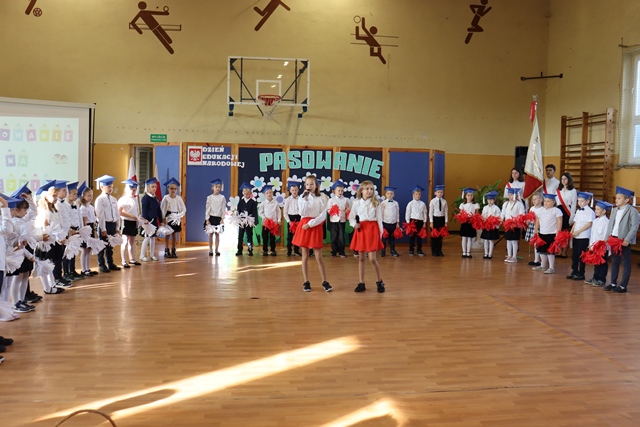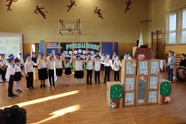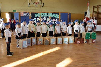W czasie uroczystości po raz pierwszy uczniowie z najstarszych klas pomogli młodszych kolegów i koleżanki wprowadzić do grona społeczności szkolnej. Pierwszaki odświętnie ubrani wystąpili przez zgromadzonymi gośćmi, rodzicami, uczniami i nauczycielami. Zaprezentowali swoje umiejętności recytatorskie oraz wokalne. Po zakończeniu części artystycznej przed pocztem sztandarowym ślubowali być dobrymi Polakami, godnie reprezentować swoją szkołę oraz swym zachowaniem sprawiać radość rodzicom i nauczycielom. Po złożeniu ślubowania Pani Wicedyrektor wielkim ołówkiem dokonała symbolicznego pasowania dzieci na uczniów. Nie zabrakło też upominków od starszych kolegów, pamiątkowych zdjęć oraz przeprowadzonych wywiadów do telewizji lokalnej. Na zakończenie dzieci wraz z rodzicami udały się na słodki poczęstunek, przygotowany przez mamy.