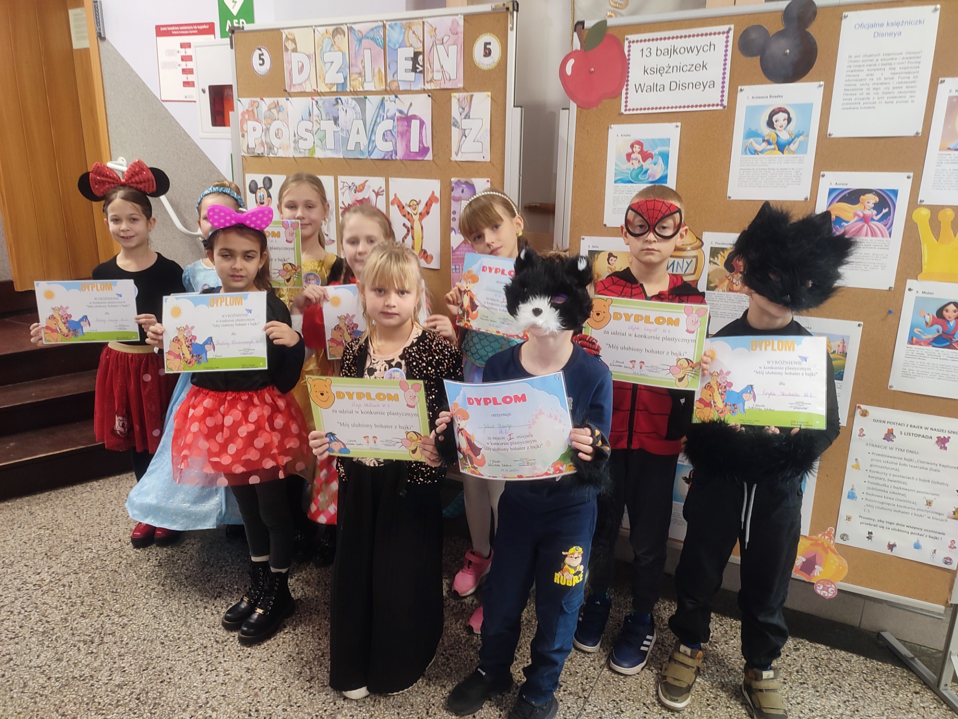 Dawno, dawno temu za siedmioma górami, za siedmioma lasami istniała niezwykła szkoła. Nie była to zwyczajna szkoła – uczyły się w niej tylko postacie z bajek! Każdego ranka do klasy przychodził Czerwony Kapturek z koszyczkiem pełnym owoców i promując zdrowe odżywianie zachęcał bajkowych uczniów do zdrowej diety. Kopciuszek po wpadce z pantofelkiem bardzo dbał o punktualność dając przykład wspaniałej organizacji i zarządzania czasem. Pinokio chcąc uniknąć wstydliwego rośnięcia nosa był przykładem uczciwości i prawdomówności. Postacie z bajek chętnie dzieliły się swoimi talentami : Arielka dawała znajomym koleżeńskie lekcje pływania, Trzy Świnki dawały instruktaż wznoszenia konstrukcji z różnorodnych materiałów. Elza i Anna uświetniały uroczystości szkolne pięknymi popisami śpiewu, a Król Lew z całym swoim stadem pilnował bram szkoły, aby wszyscy uczniowie mogli czuć się swobodnie i bezpiecznie… Mimo jego warty pewnego jesiennego dnia wydarzyło się coś, co zburzyło codzienny spokój i beztroskę. Księga Bajek – najważniejsza w całej szkole, zniknęła bez śladu, wszyscy byli przerażeni zaistniałą sytuacją. Pani Dyrektor Sowa Mądra Głowa tego samego dnia zwołała apel w bibliotece i ogłosiła konkurs oraz wyznaczyła nagrodę – Kto pierwszy znajdzie zaginioną księgę pojedzie na dwudniową wycieczkę do Disneylandu. W tym samym czasie do biblioteki zapukali i weszli nowi uczniowie bajkowej szkoły: Myszka Miki, Kubuś Puchatek i Stitch. Zdziwieni, zapytali dlaczego wszyscy zgromadzili się właśnie w bibliotece. Pani Dyrektor Sowa Mądra Głowa wyjaśniła nowym uczniom, że zaginęła najważniejsza księga w całej szkole – Księga Bajek, a uczniowie chórem zawołali, że został ogłoszony konkurs i wyznaczono nagrodę dla osoby, która znajdzie księgę. Kubuś Puchatek, choć był bardzo nieśmiały wyjął ze swojego miodowego plecaka grubą, kolorową książkę i zapytał czy to ta księga. Niestety wszyscy zgodnie i ze smutkiem pokiwali przecząco głowami. Jednak Myszka Miki, która jest optymistą przekazała wszystkim, że idąc do szkoły przez las zauważyła, że na polanie Baba Jaga przed swoim domkiem z piernika z zaciekawieniem czyta wielką księgę… Wszyscy szybko zebrali się w kółko, żeby ustalić, co robić. Pani Dyrektor Sowa Mądra Głowa zrobiła listę zadań. To był bardzo sprytny plan, bo każdy miał robić to, co potrafi najlepiej!