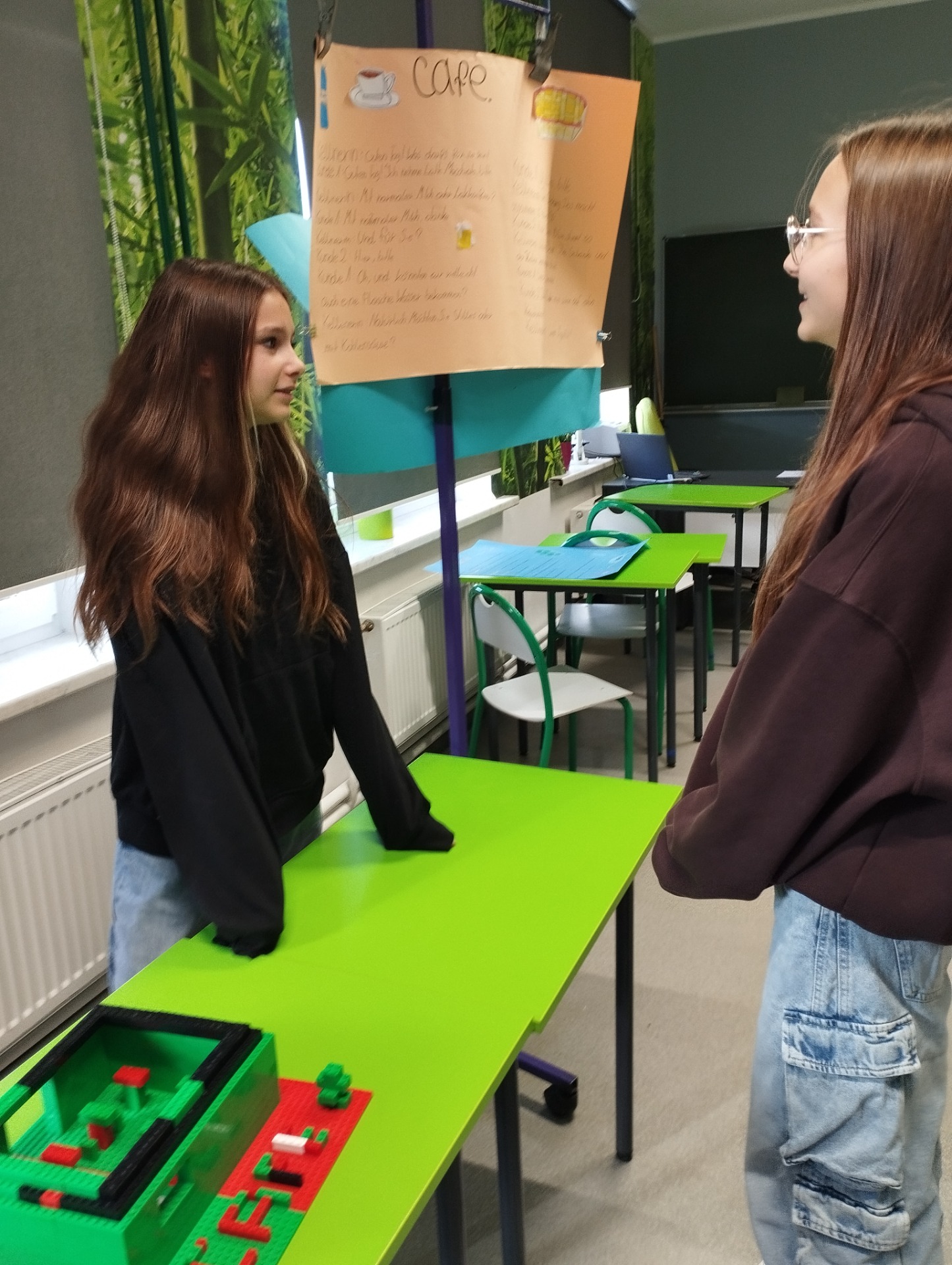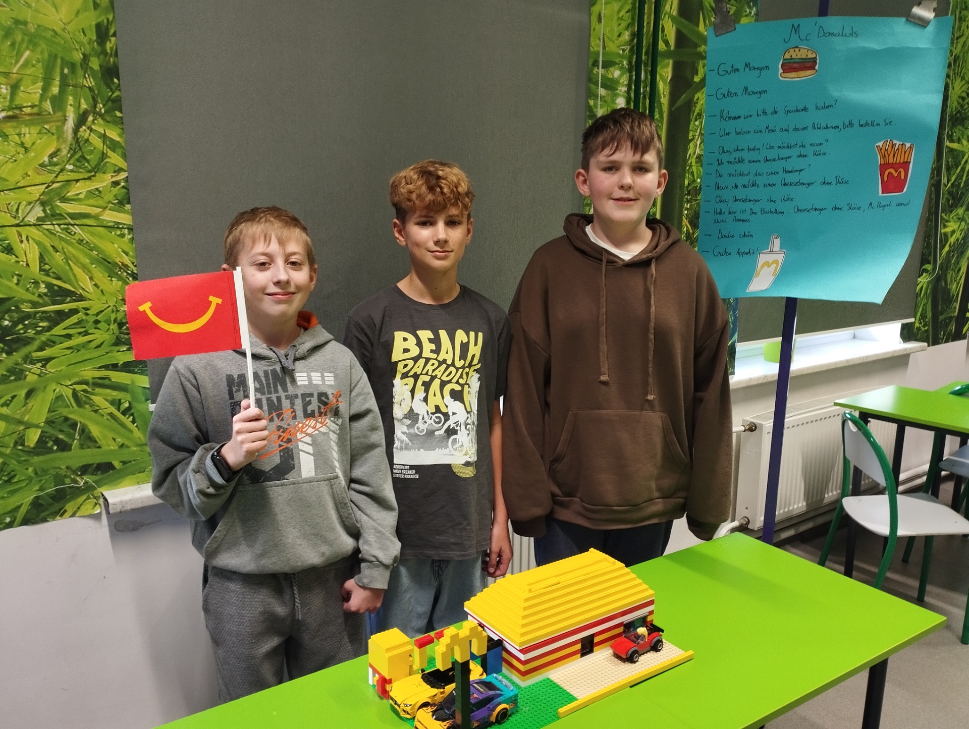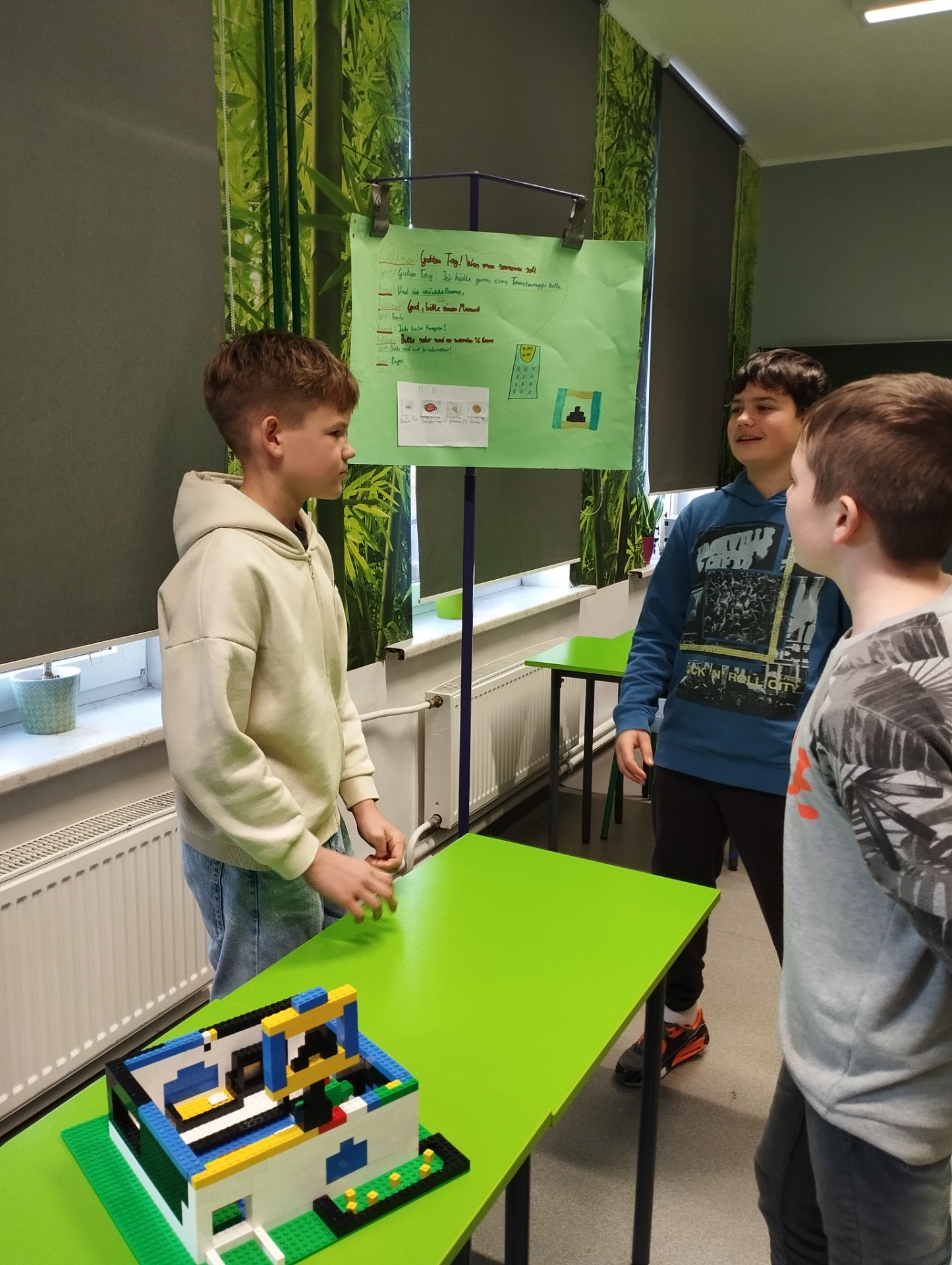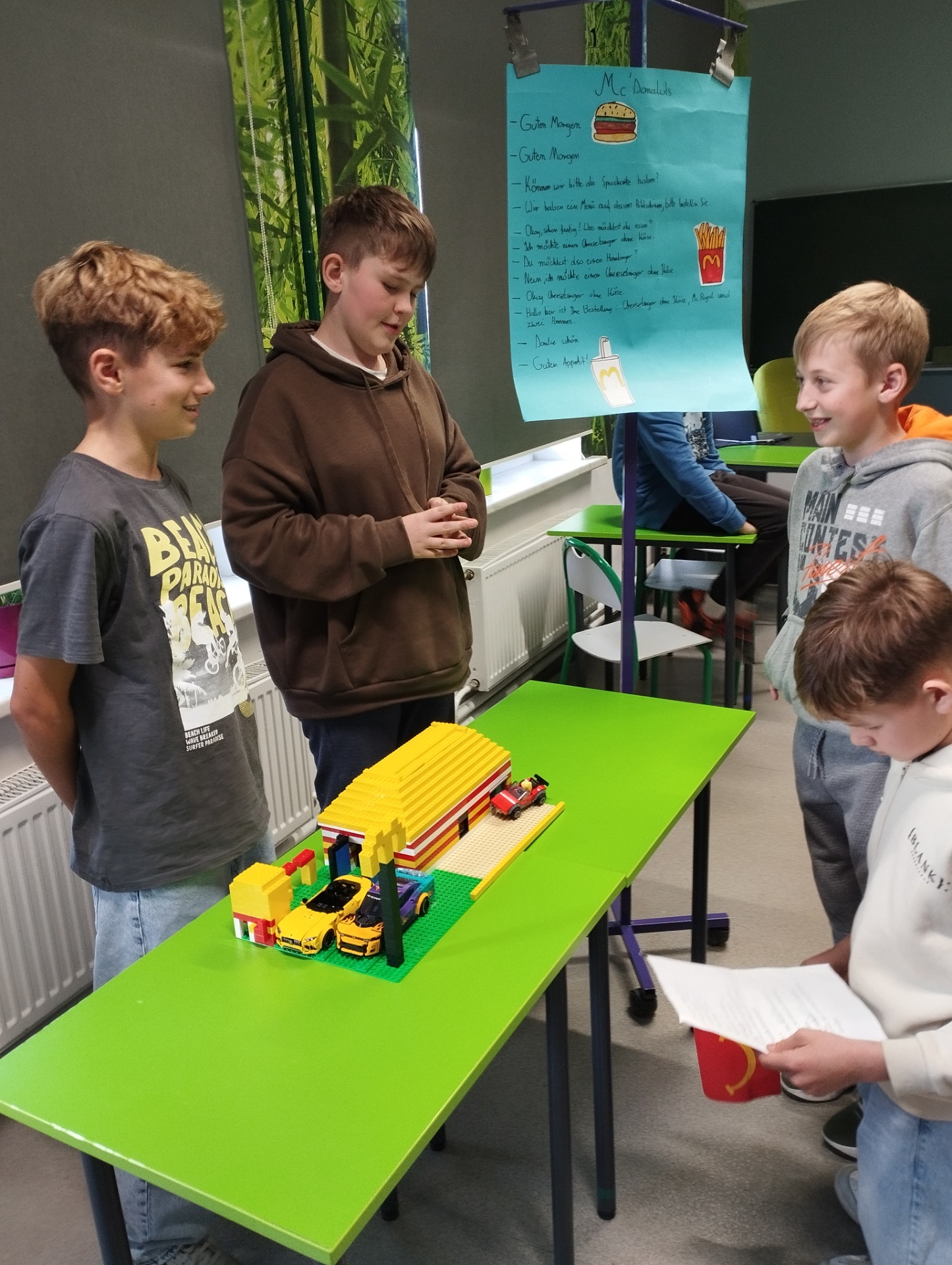 Klocki LEGO w restauracji? Dlaczego nie? Uczniowie klasy 6 podjęli wyzwanie - opracowali w grupach dialogi tematyczne, a następnie zaprojektowali i zbudowali modele wybranych przez siebie lokali, w których mieli złożyć zamówienie. Do każdego projektu przygotowany został plakat z treścią rozmowy. W dniu prezentacji uczniowie przedstawili krótkie scenki tematyczne z wykorzystaniem drobnych rekwizytów oraz zbudowanych wcześniej modeli z klocków. Wystąpienie w języku niemieckim przed klasową publicznością dostarczyło wielu emocji, a uczniowie mieli okazję ćwiczyć kreatywność, współpracę i wcielanie się w rolę. Wszystkie występy zostały nagrodzone oklaskami, a na koniec podziwialiśmy galerię naszych LEGO-restauracji.