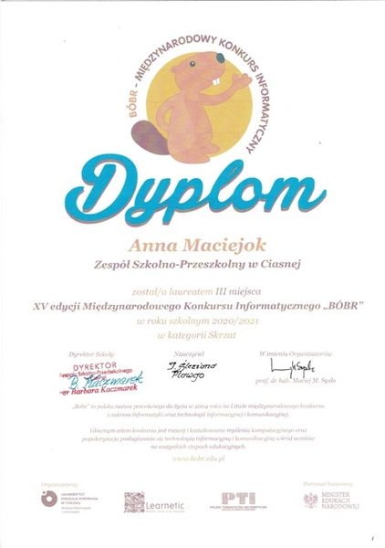 25 stycznia 2021 Aktualności Sukces Ani w Międzynarodowym Konkursie Informatycznym... Z przyjemnością informujemy, że uczennica klasy IIIb Anna Maciejok zajęła III miejsce w XV edycji Konkursu Informatycznego „Bóbr” 2020. "Bóbr" to... Czytaj więcej